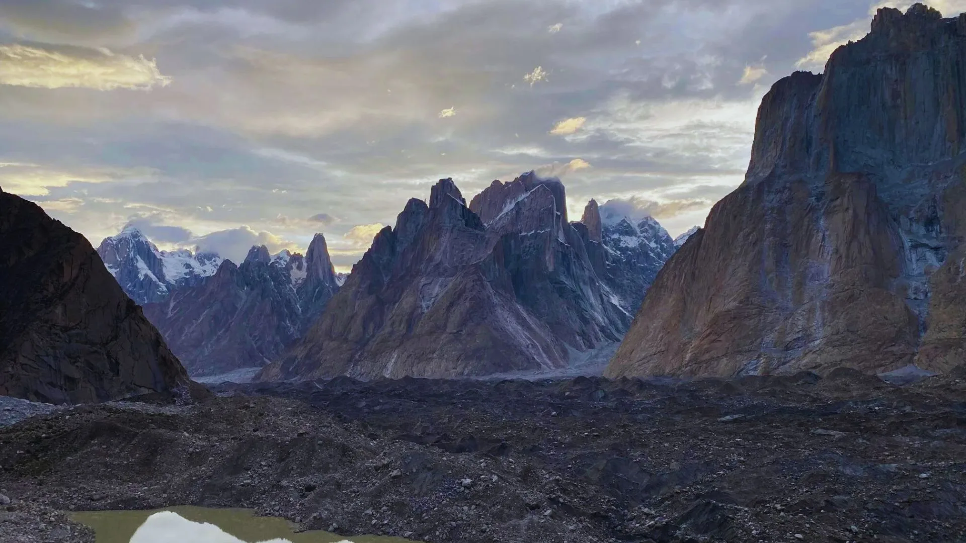We move deeper into the Baltoro Glacier, passing views of Masherbrum (7,800 m), Gasherbrum IV, and Muztagh Tower.