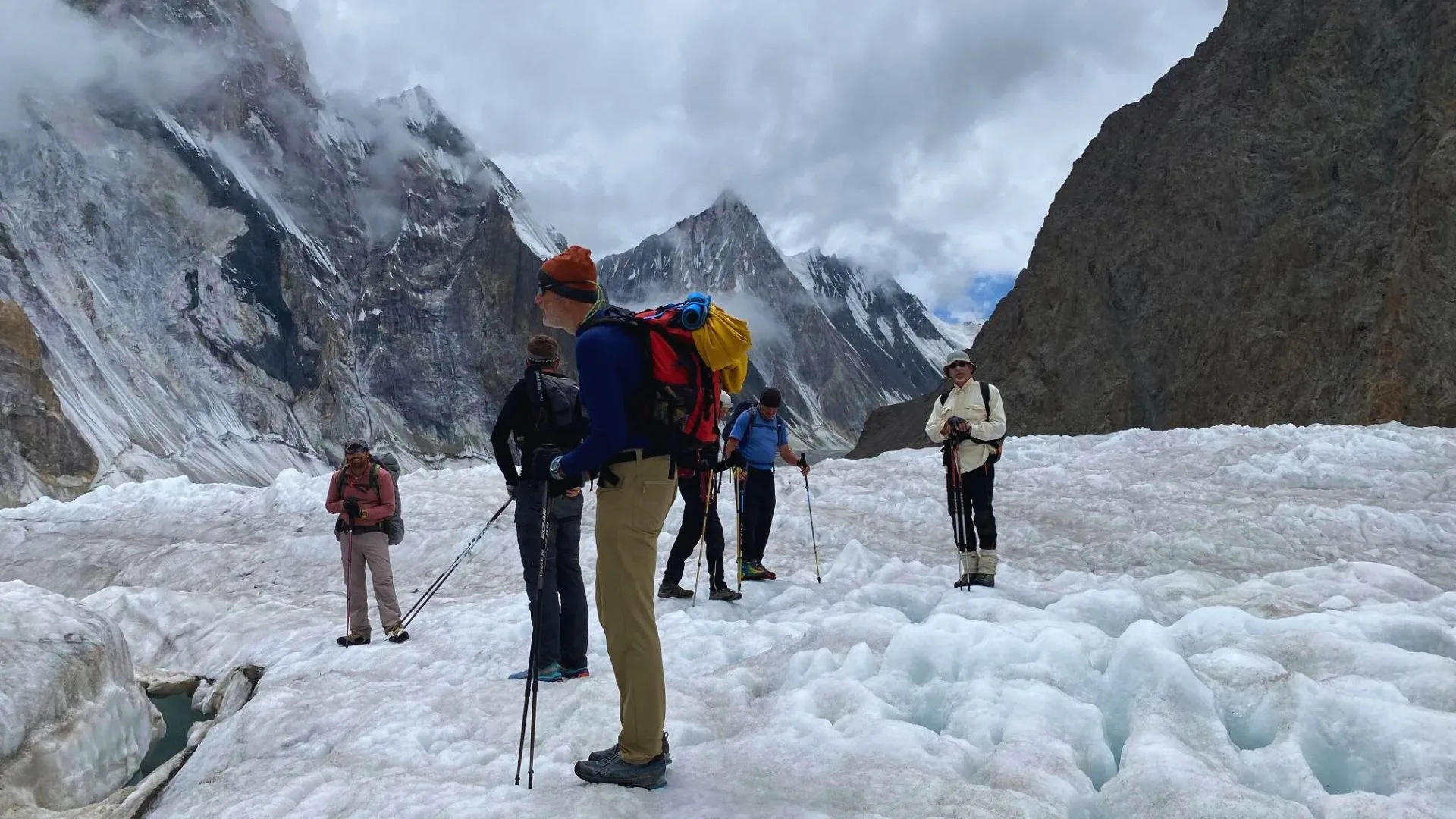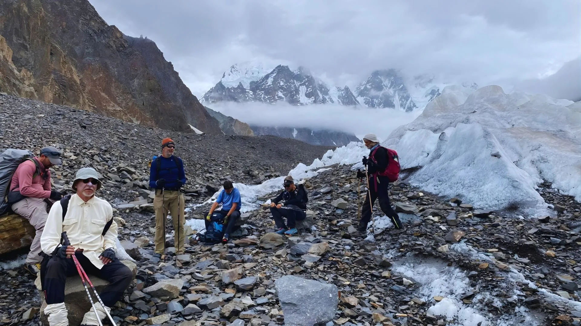 We reach the snout of the Baltoro Glacier and begin trekking over its rocky, undulating surface. The trail alternates between moraine and ice.